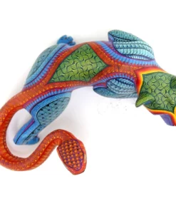 El alebrije Jaguar cola de serpiente es una obra de arte impresionante que combina la energía y la pasión del jaguar con la seducción y la elegancia de la serpiente. El alebrije presenta un paño de colores tropicales, como verdes, morados, azules y naranjas, que se mezclan para crear un efecto visual dinámico.