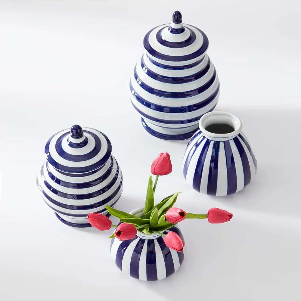 JARRÓN DE PORCELANA BLANCA LINEAS AZULES