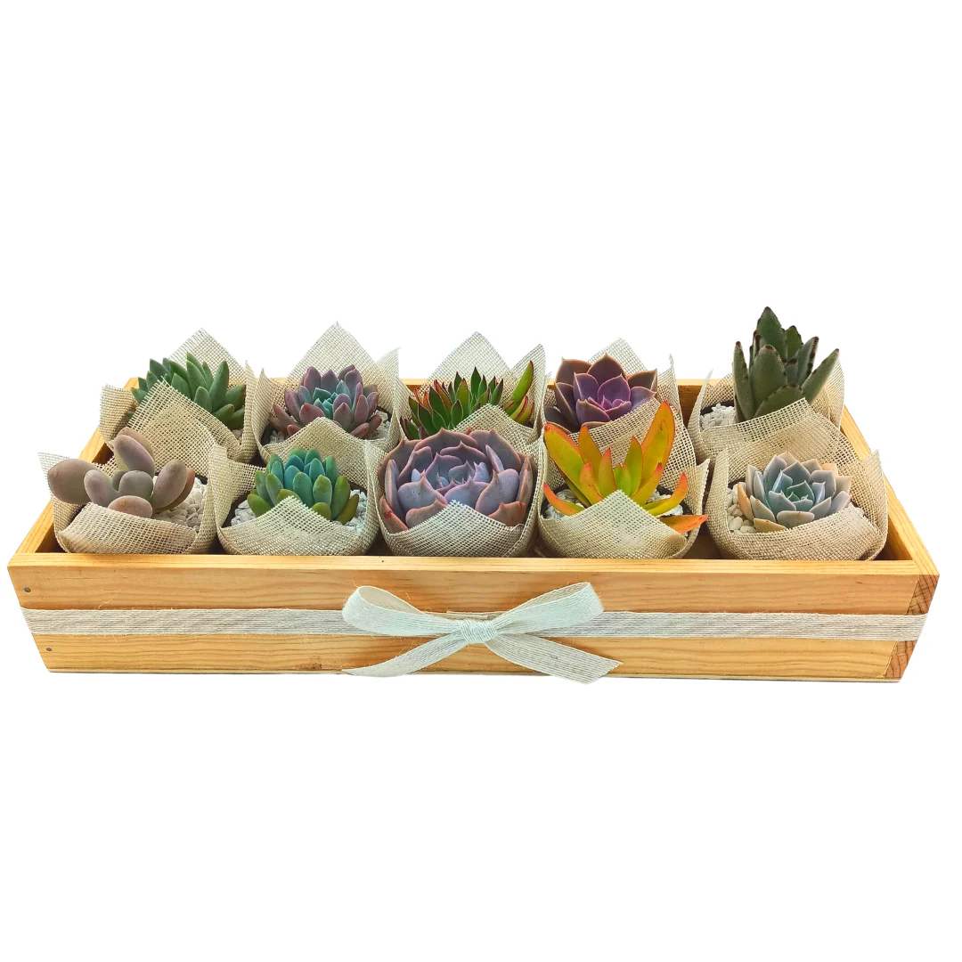 Caja de madera con 10 macetas con suculenta mediana decoradas con yute y listón, ideal para un centro de mesa. (Las especies utilizadas en el arreglo pueden variar según la disponibilidad)