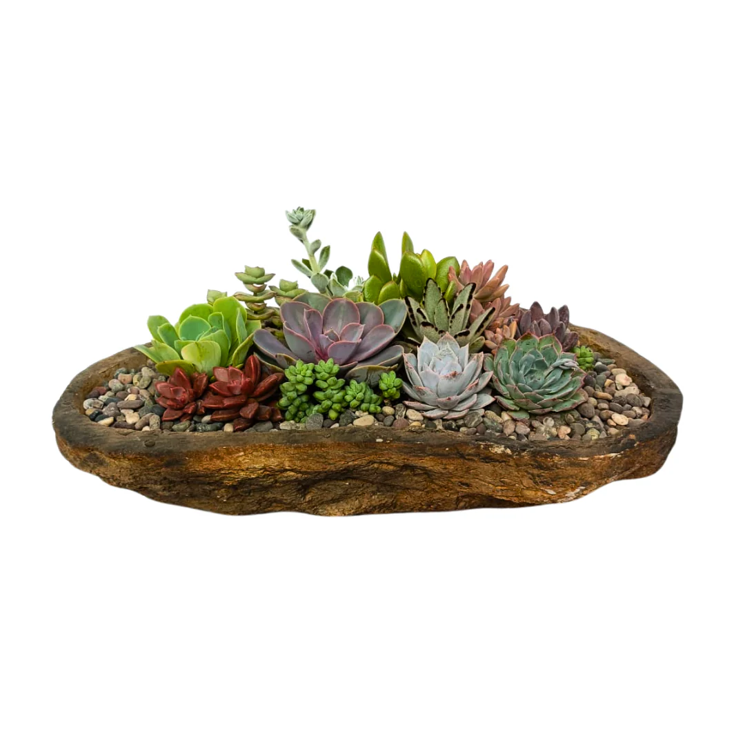 Arreglo en maceta tipo roca decorado con plantas suculentas.